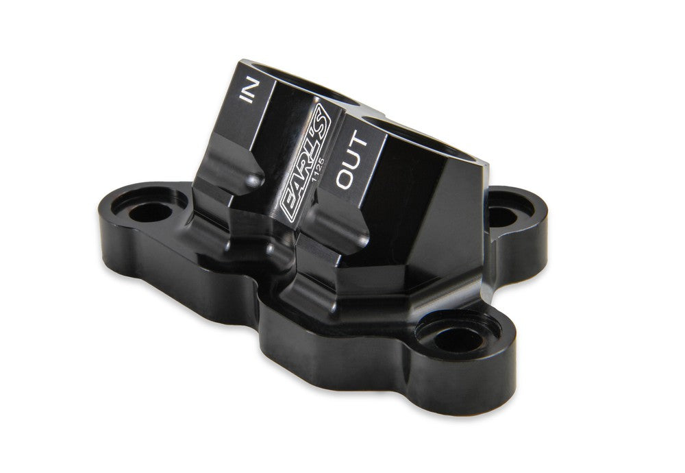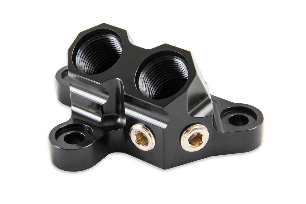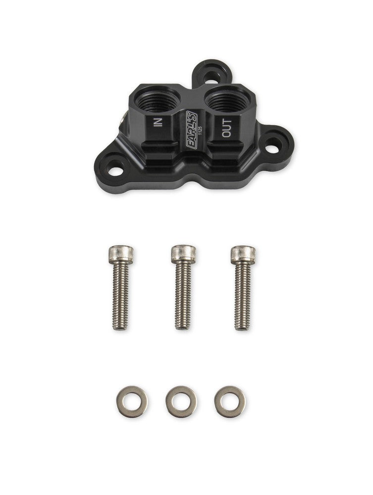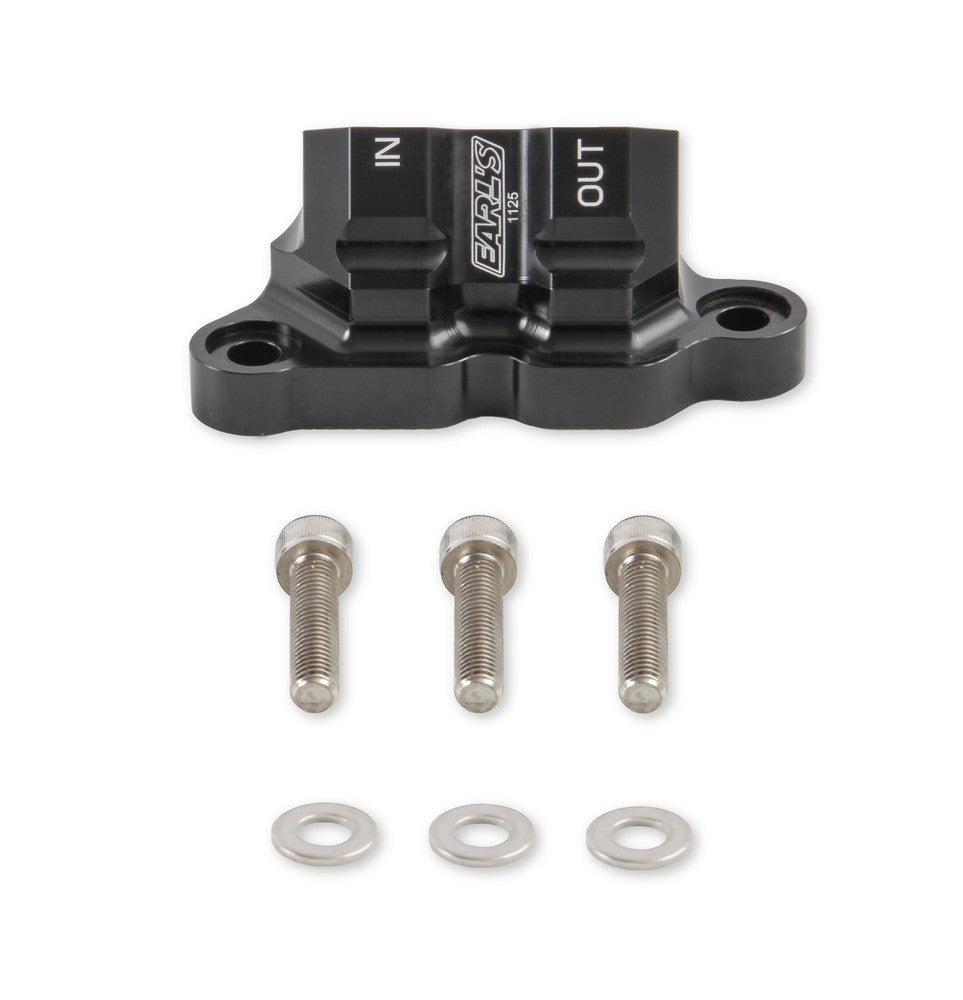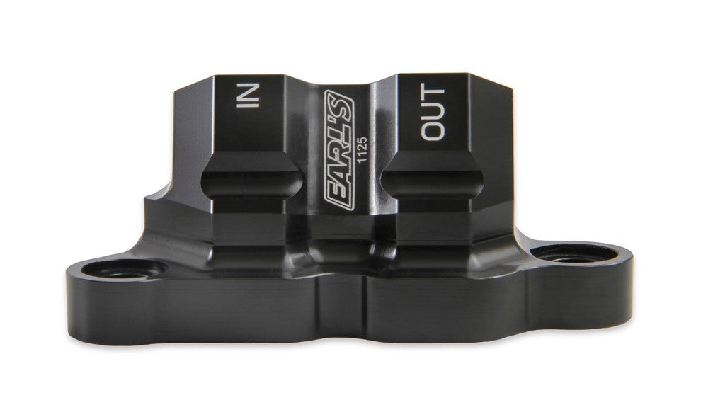 Earl's new billet by-pass adapter replaces the stock oil filter housing and allows the installation of a remote oil filter (and optional oil cooler) on the Ford 5.0L Coyote engine. This adapter features 10 AN O-Ring ports, O-Ring Seals to the block, and (2) 1/4" NPT ports. Black anodized and laser etched with "In" & "Out" markings for easy plumbing. Add an Earl's remote oil filter mount 2077ERL, and AN hose & hose ends to complete the installation.